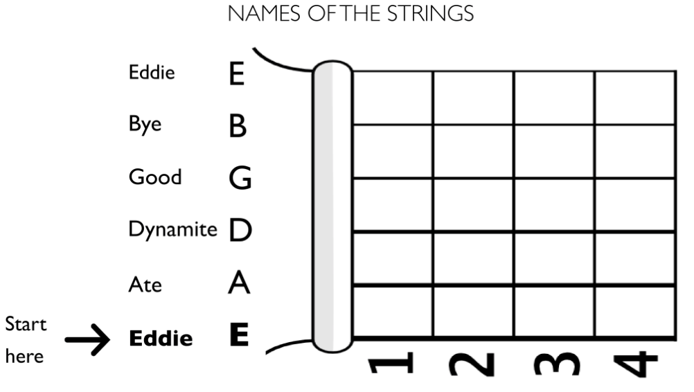 Learn the names of the strings by starting down the bottom with the